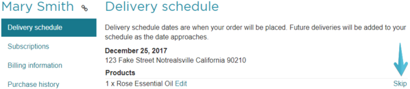 Once logged in, click on Delivery Schedule on the left to see all upcoming deliveries for your subscriptions. To skip a delivery you can click Skip to the right of each one.
